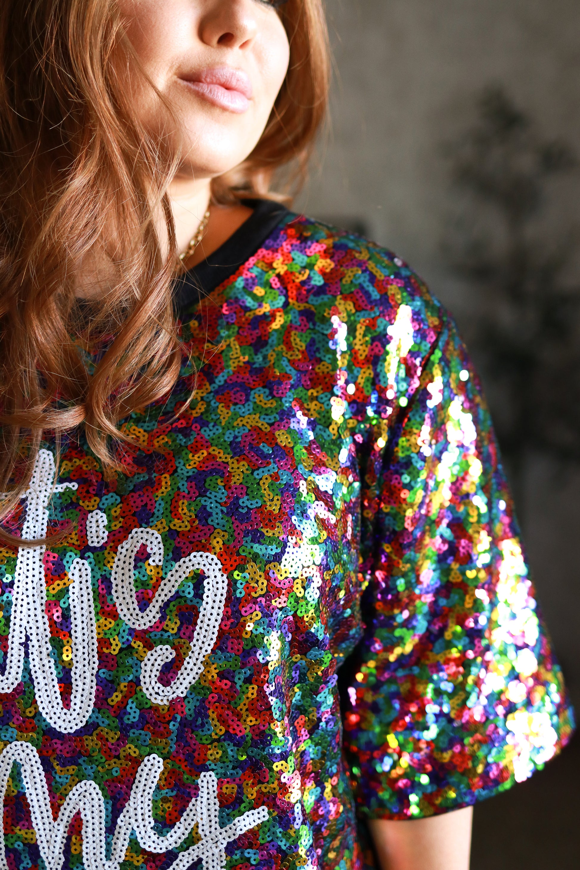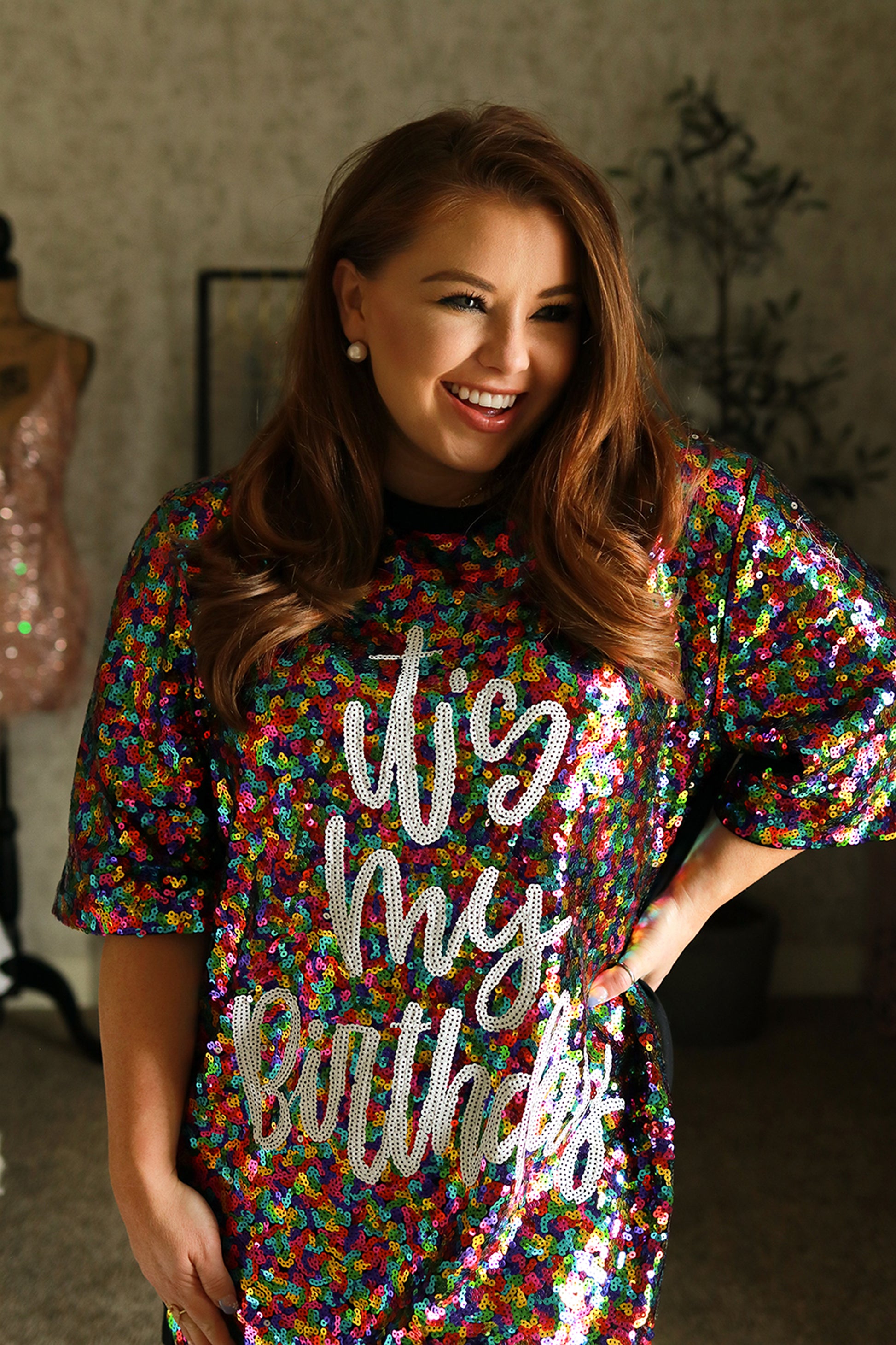 It's My Birthday T-shirt Dress features multi color sequence with white sequence letters on the front. The back of the T-shirt dress features solid black comfy material. This item comes in one size OS.