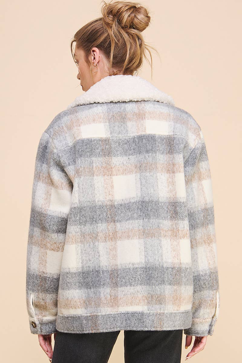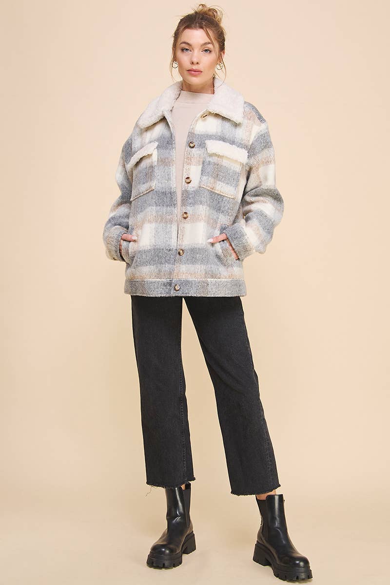Wrap yourself in comfort with the Winter Cabin Shacket, the perfect blend of cozy and classic. Designed with a soft plaid pattern and a plush teddy collar, this long-sleeve shirt jacket brings warmth and charm to any cold-weather outfit.