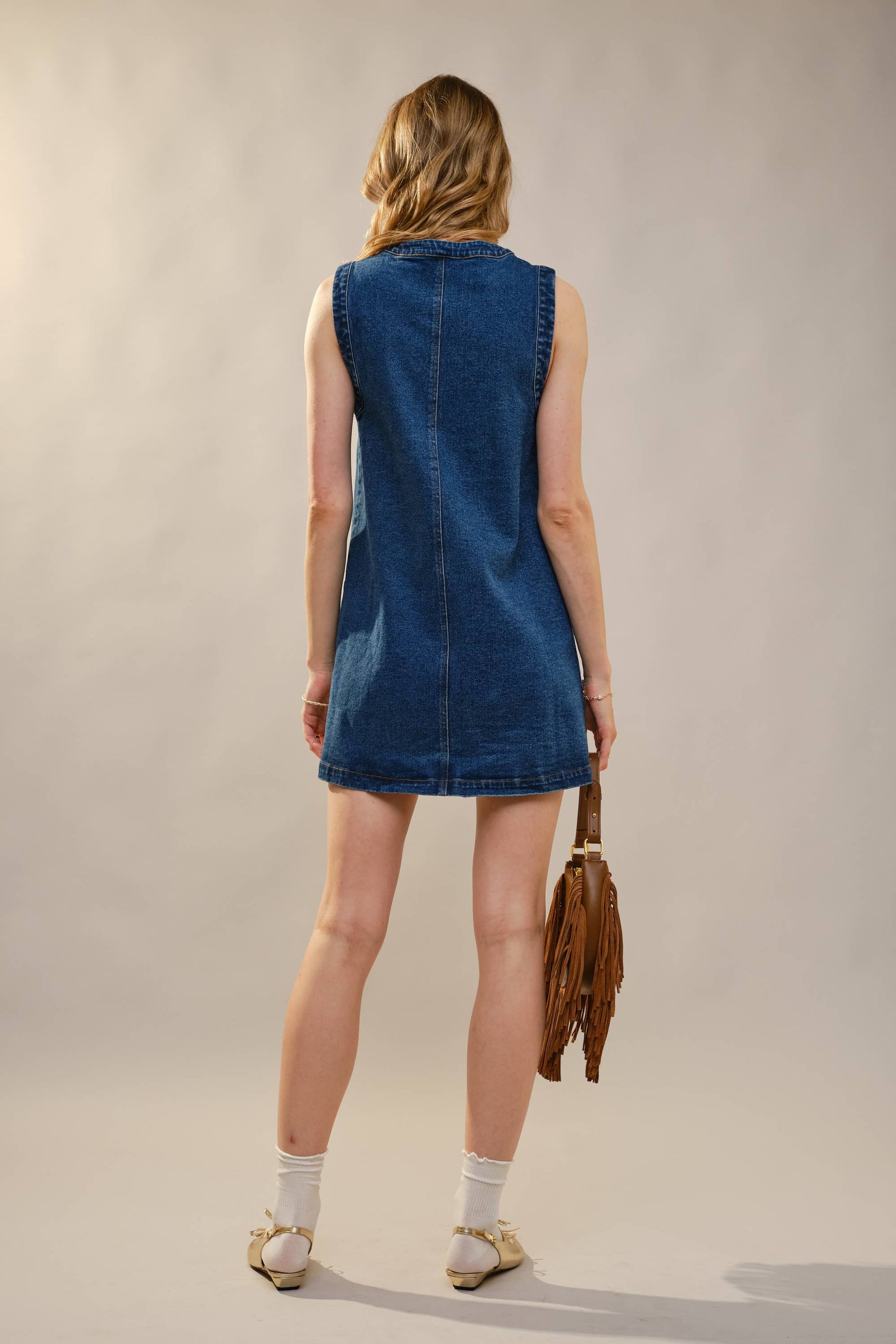 • Dark wash denim mini dress
