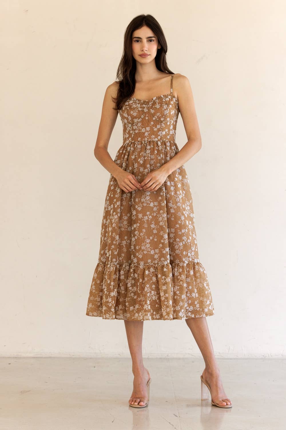 Finished with a ruffled hem that moves with every step, this midi is equal parts feminine and timeless — perfect for layering under a cozy cardigan or wearing on its own as the season turns.