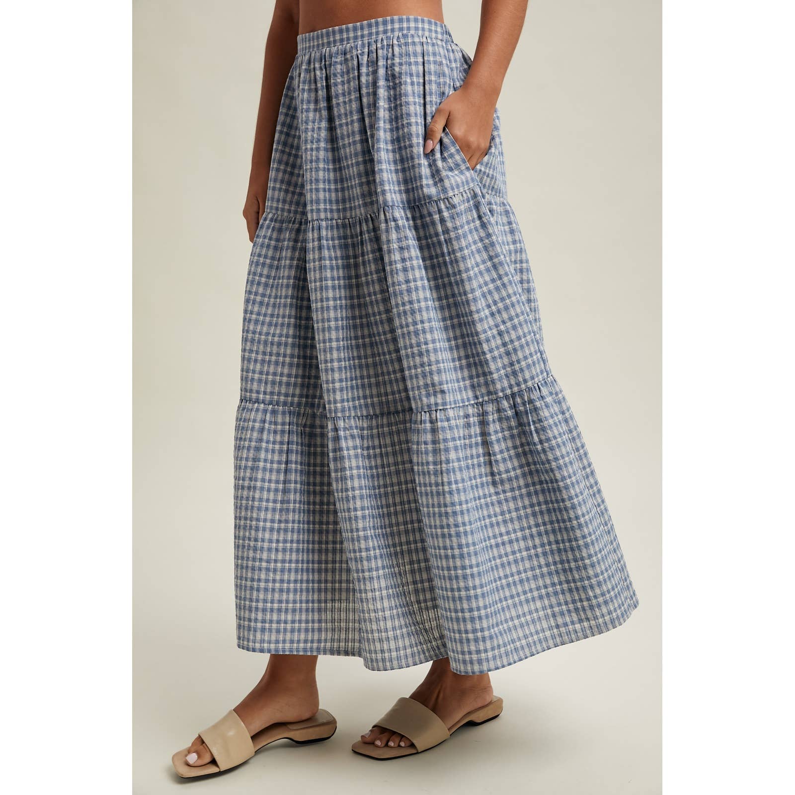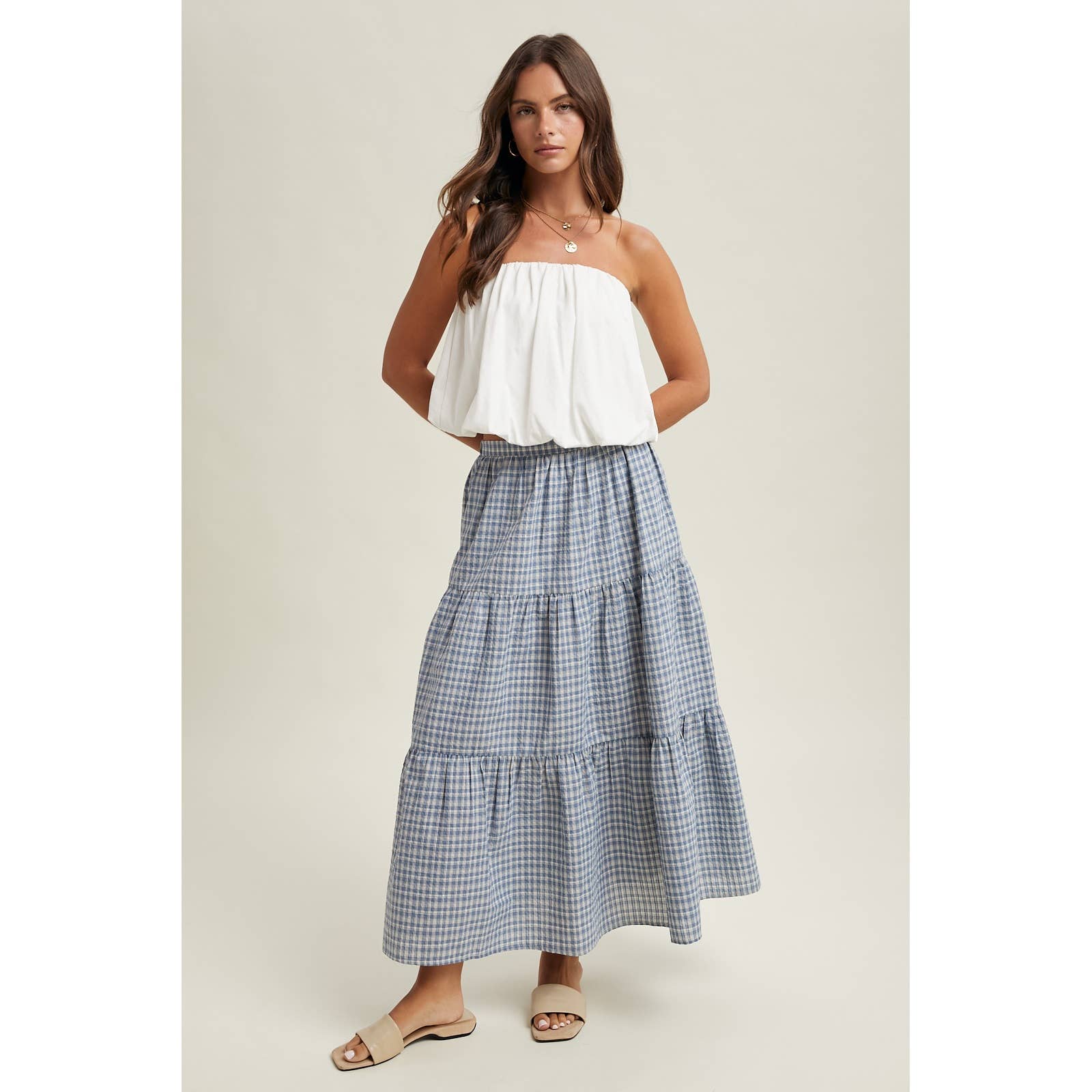 The Sunday Garden Midi Skirt is an easy, charming piece made for spring celebrations and everyday wear. Designed in a soft plaid pattern, this tiered midi silhouette moves beautifully while maintaining a relaxed, feminine feel.